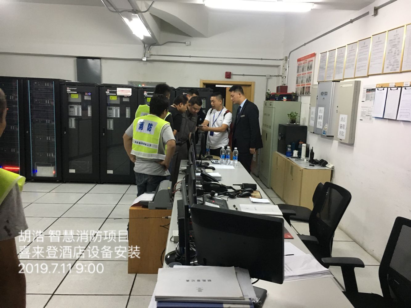 “智慧消防”就是指运用物联网、大数据等技术手段,将消防设施、社会化消防监督管理、灭火救援等各位要素结合起来,全面促进与提高消防监督与管理水平,增强灭火救援的指挥、调度、决策和处置能力,提升消防管理智能化、社会化水平。图为实为公司承接的智慧消防项目在喜来登酒店进行设备安装。