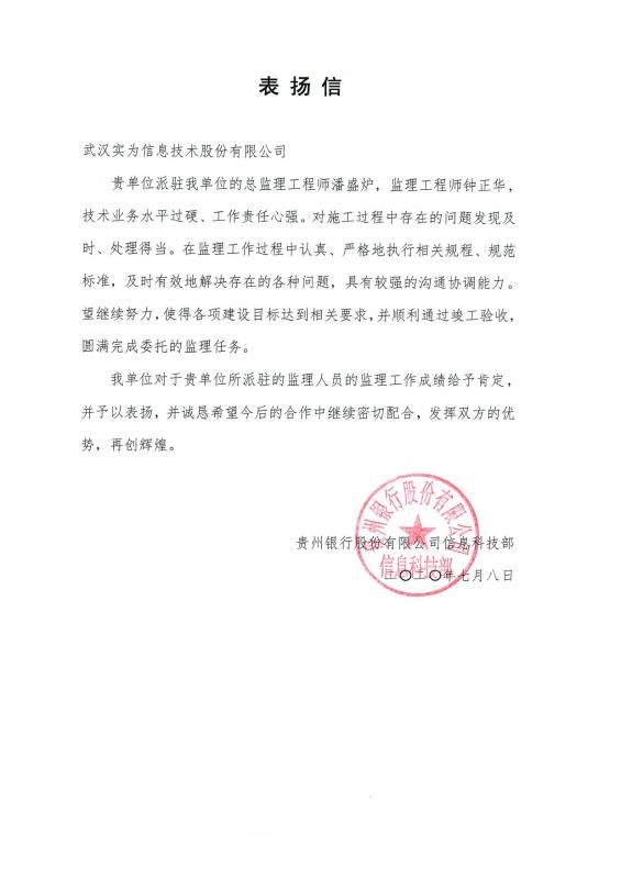 实为公司承担贵州银行股份有限公司总行办公大楼安防及智能化设计建设项目监理服务过程中,严格执行相关规范标准,及时有效解决项目存在的各种问题,获得业主单位的充分肯定。