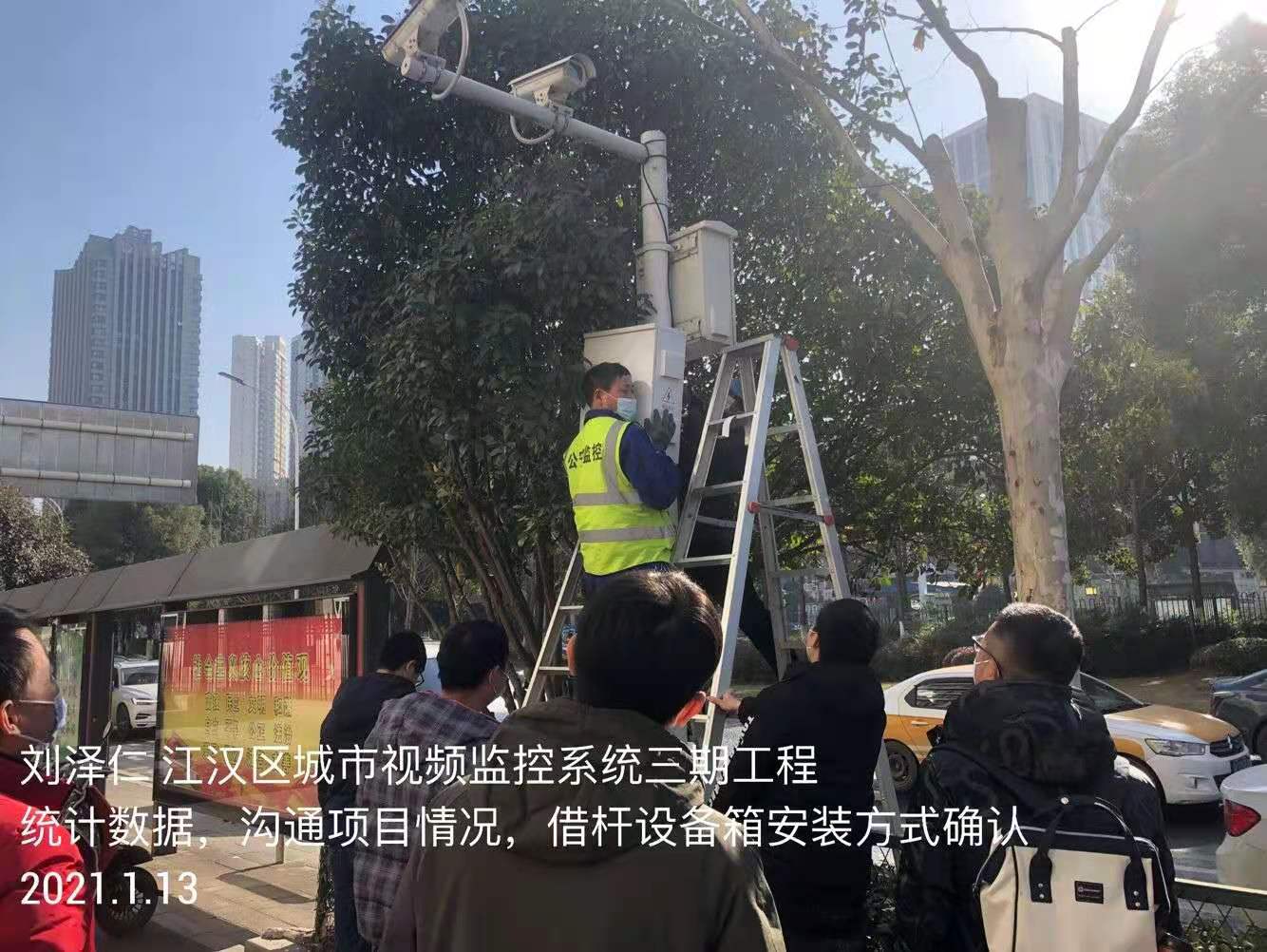 图为武汉实为公司现场工程师统计数据、和施工方沟通项目进展情况及借杆设备箱安装方式的确认