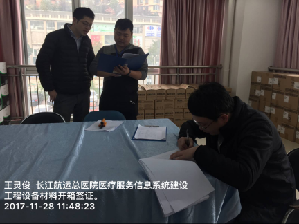 设备签证是监理的基本工作,实为公司拥有设备监理的专业资质,图为实为员工在长江航运总医院医疗服务信息系统建设工程设备材料开箱签证。