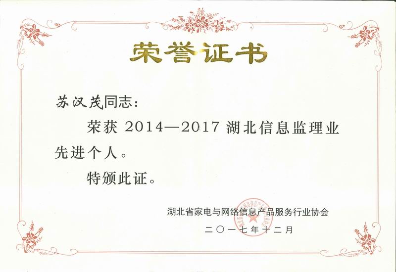 根据湖北省家电与网络信息产品服务行业协会2017年12月15日发布的《关于开展2014-2017年优秀单位及先进个人评选活动的通知》,公司积极参与协会活动,经协会会长办公会审核决定,咨询部负责人苏汉茂、平安城市事业部负责人王鹏被评为“湖北信息监理先进个人”。