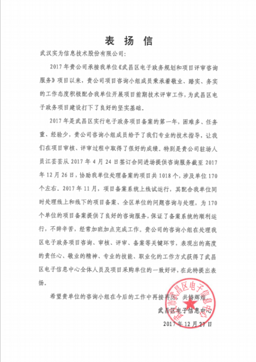 实为公司员工通过自身的业务水平、责任心、积极地工作态度,在武昌区电子政务规划和项目评审咨询项目中为项目提供技术指导并获得业主单位好评,并获得各方认可。实为公司会一直秉承实为理念,传递认真负责的工作态度,更好的为各项目提供服务,献计献策。