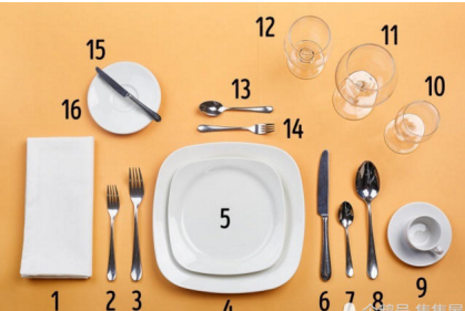 1.餐巾(延伸在膝盖上);2.沙拉叉;3.叉子;4.菜;5.沙拉盘;6.刀;7.茶/咖啡/茶匙;8.汤匙;9.杯子和碟子(甜点);10.白葡萄酒;11.红葡萄酒;12.杯子喝水;13.甜点的勺子;14.甜品叉;15.甜点刀;16.面包板。